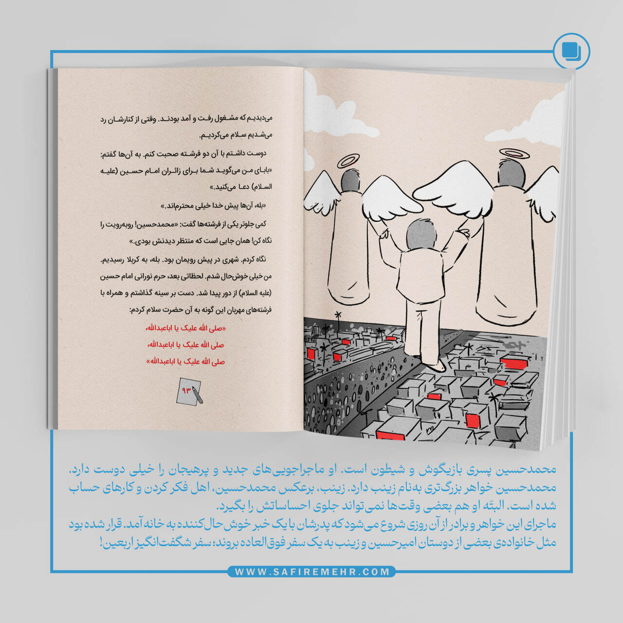 البتّه، مطالعه‌ی این کتاب به همین‌ راحتی‌ها نیست. بعد از هر فصل داستان، آقای نویسنده به‌سراغ‌تان می‌آید و ماموریت مهمّی را به شما می‌سپارد. با موفقیت در این کار، می‌توانید فصل بعدی کتاب را مطالعه کنید و ببینید که ماجراجویی‌ امیرحسین و زینب به کجا می‌رسد. به نظر شما، آیا آن‌ها می‌توانند در نهایت خودشان را به شهر امام حسین برسانند؟